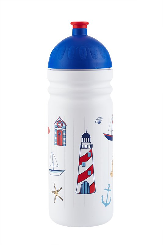 ZDRAVÁ LAHEV Námořnická 0,7l je střední velikost z objemových řad Zdravých lahví. Decentní design ocení hlavně dospělí školáci, sportovci a senioři. Je určena každému, kdo má rád jednoduché a hravé námořní motivy. Design lahve Námořnická tvoří krásné námořní motivy s červeno-bílým majákem v hlavní roli, obklopeným malou plachetnicí, hradem z písku, kotvou, rybkami, hvězdicemi, záchranným kruhem, kromidlem, lanem, rackem a mušlemi. To vše na matně bílém těla lahve s tenkými šedými proužky. Celek dotváří tmavě modré víčko a červená zátka.