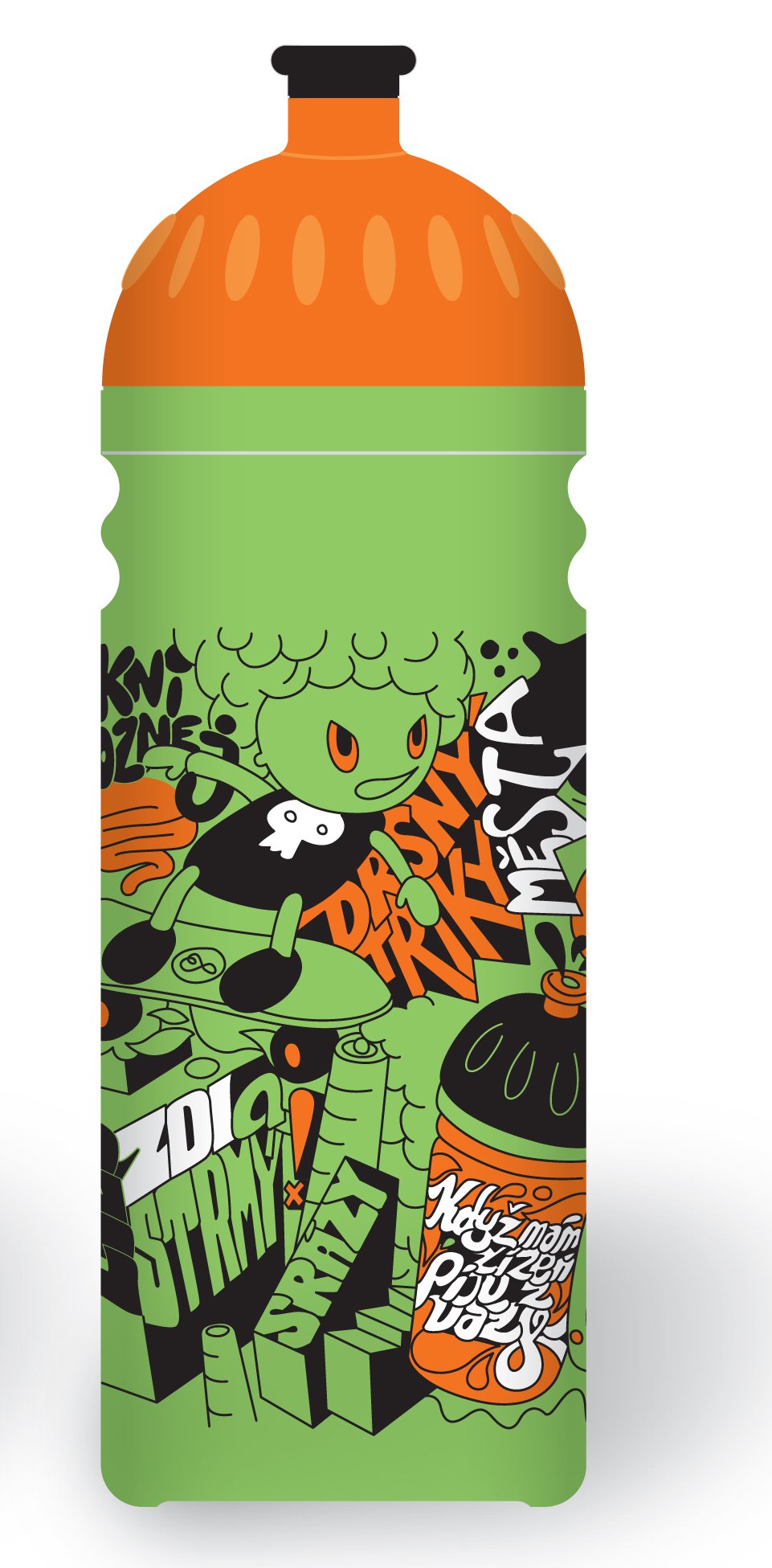 ZDRAVÁ LAHEV Street Art 0,7l je střední velikost z objemových řad Zdravých lahví. Pestobarevný design ocení hlavně dospělí školáci, sportovci a grafiťáci všeho věku. Design lahve Street Art tvoří narozdíl od láhve graffitti pouze čtyři základní barvy, pomocí nichž jsou vytvořeny decentní oblíbené motivy pouličních umělců. Základní barvou je pastelově zelená, doplněná oranžovou, černou a bílou. Celek dotváří oranžové víčko a černá zátka.