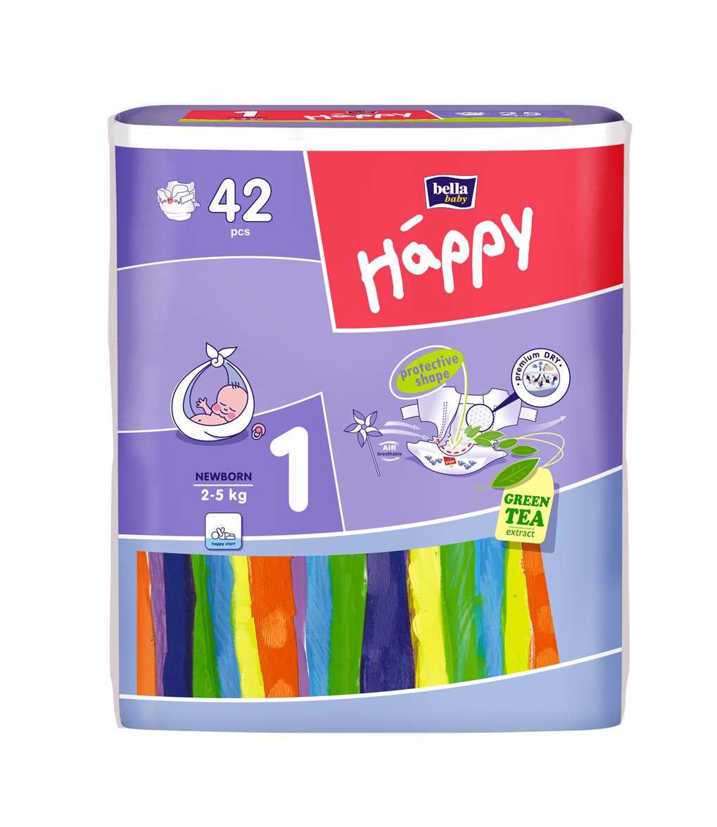 Plenky Bella Baby Happy jsou určené pro novorozence s váhou okolo 2 až 5 kilogramů. Pleny New Born se vyznačují speciálním výřezem v přední části pro pupík. Lem pleny ho díky tomu nezakrývá, nedráždí a nechává ho naopak v klidu větrat a hojit. V tomto období nejsou děti ještě tolik aktivní a je potřeba především zajistit pocit sucha, který následně dopomůže klidnému spánku. Plenky Bella Happy mají kvalitní prodyšnou vnější vrstvu pro stálý přístup vzduchu k citlivé dětské pokožce. Vnitřní povrch plen je opatřen extraktem ze zeleného čaje. Ten má vysoce protizánětlivé vlastnosti, zabraňuje tvorbě nežádoucích bakterií a aktivně snižuje nepříjemný zápach.