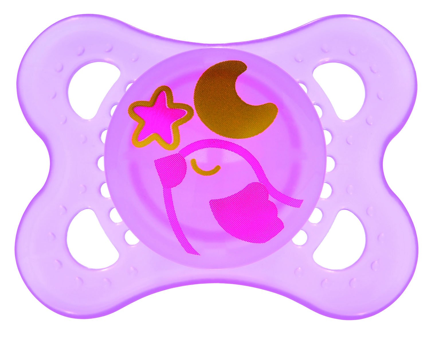 Mam Night uklidňující dudlík růžový se silikonovou savičkou je vhodný jak pro holčičky již od narození. Knoflík dudlíku Mam Night svítí ve tmě a tak ho vždy snadno a rychle najdete. Velké otvory, které jsou v límci kolem savičky umožňují přístup vzduchu k pokožce a ta tak není po celé noci podrážděná. Povrch dudlíku je navíc jamkovitý a tak jsou sliny ihned odváděny od pokožky. Obrázek je pouze ilustrativní. Dekor středu dudlíku nejsme schopni ovlivnit, vzhledem k tomu, že MAM produkuje každého čvrt roku stovky nových dekorů dudlíků.