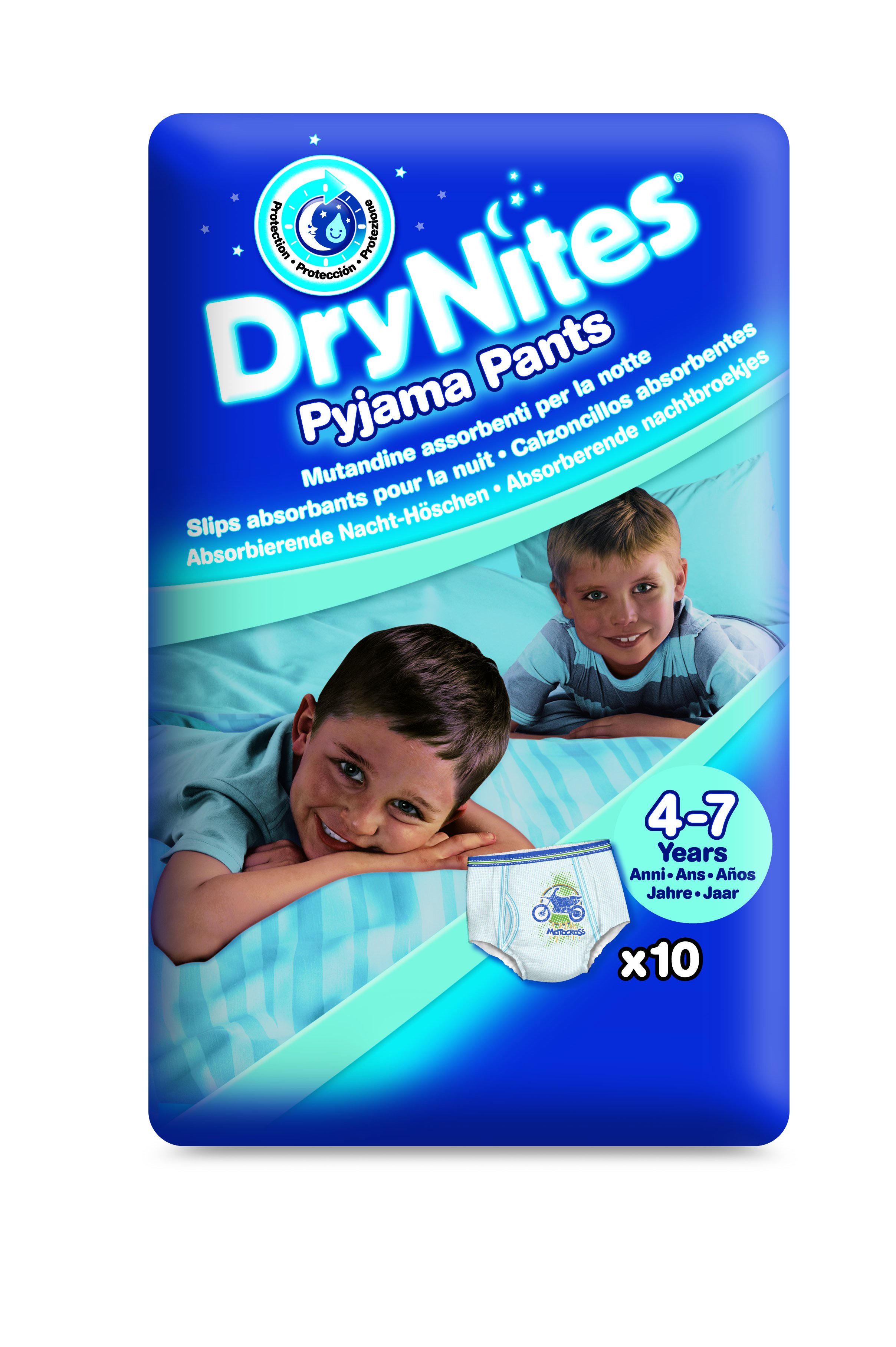 Plenkové kalhotky Huggies Dry Nites jsou určeny pro děti od 4 do 7 let a váhy 17 až 30 kg, jenž trápí noční pomočování. Kalhotky pro chlapce připomínají běžné slipy a taky se tak používají. Natahují se jako normální spodní prádlo a jsou tak tenké, že pod pyžamem nebo oblečením nejsou prakticky vidět.